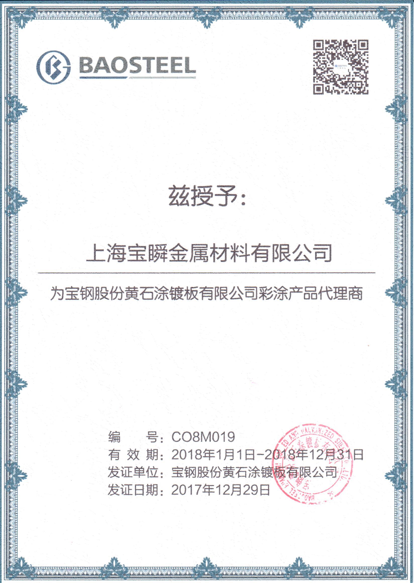 2018年寶鋼黃石代理證書(shū)
