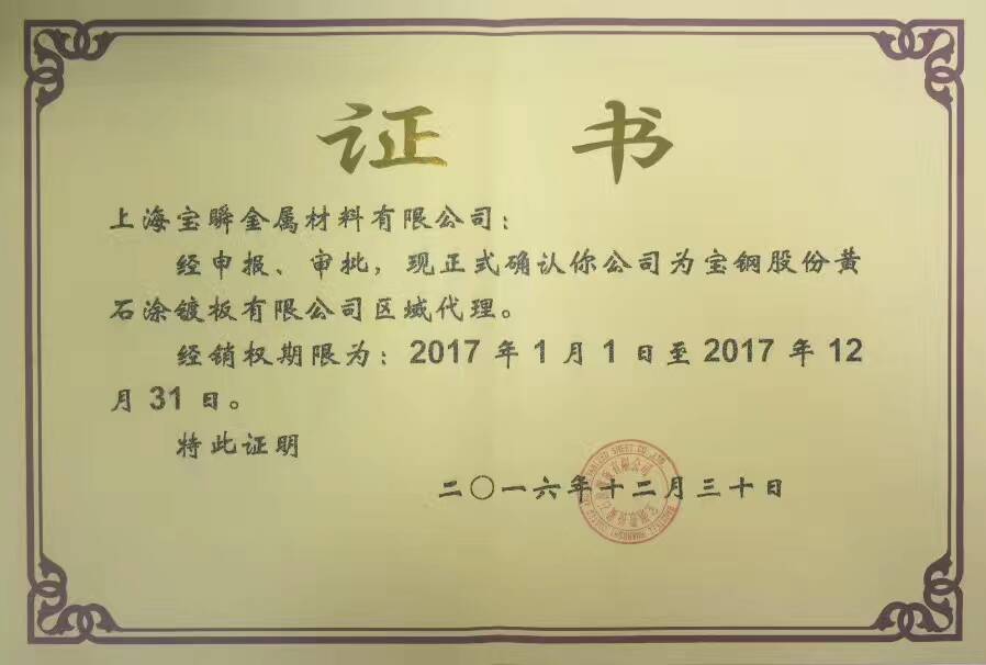 2017年寶鋼黃石代理證書(shū)