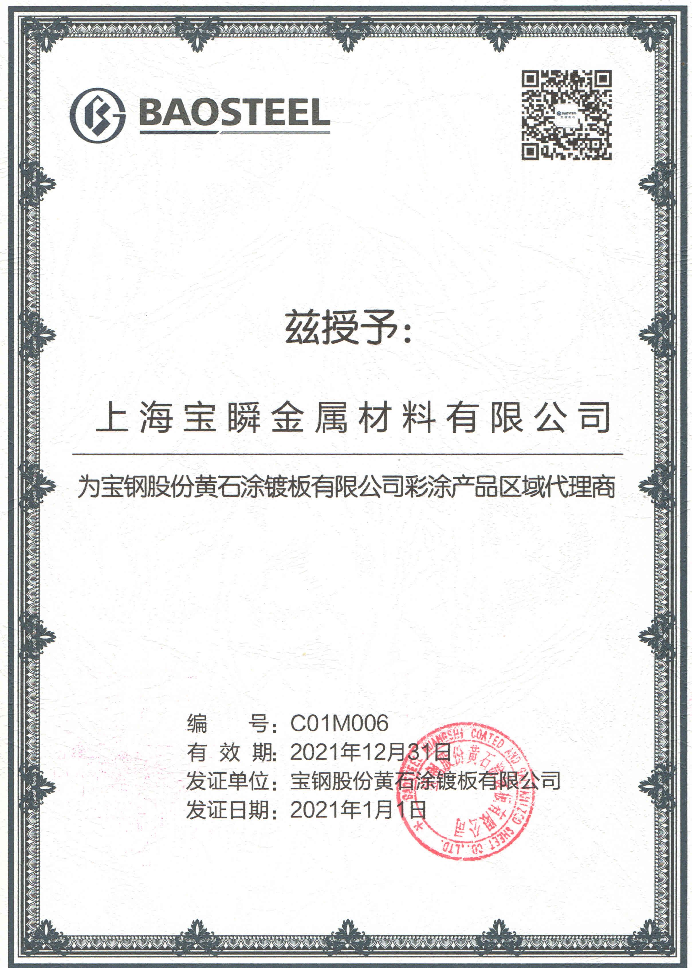 2021年寶鋼黃石代理證書(shū)