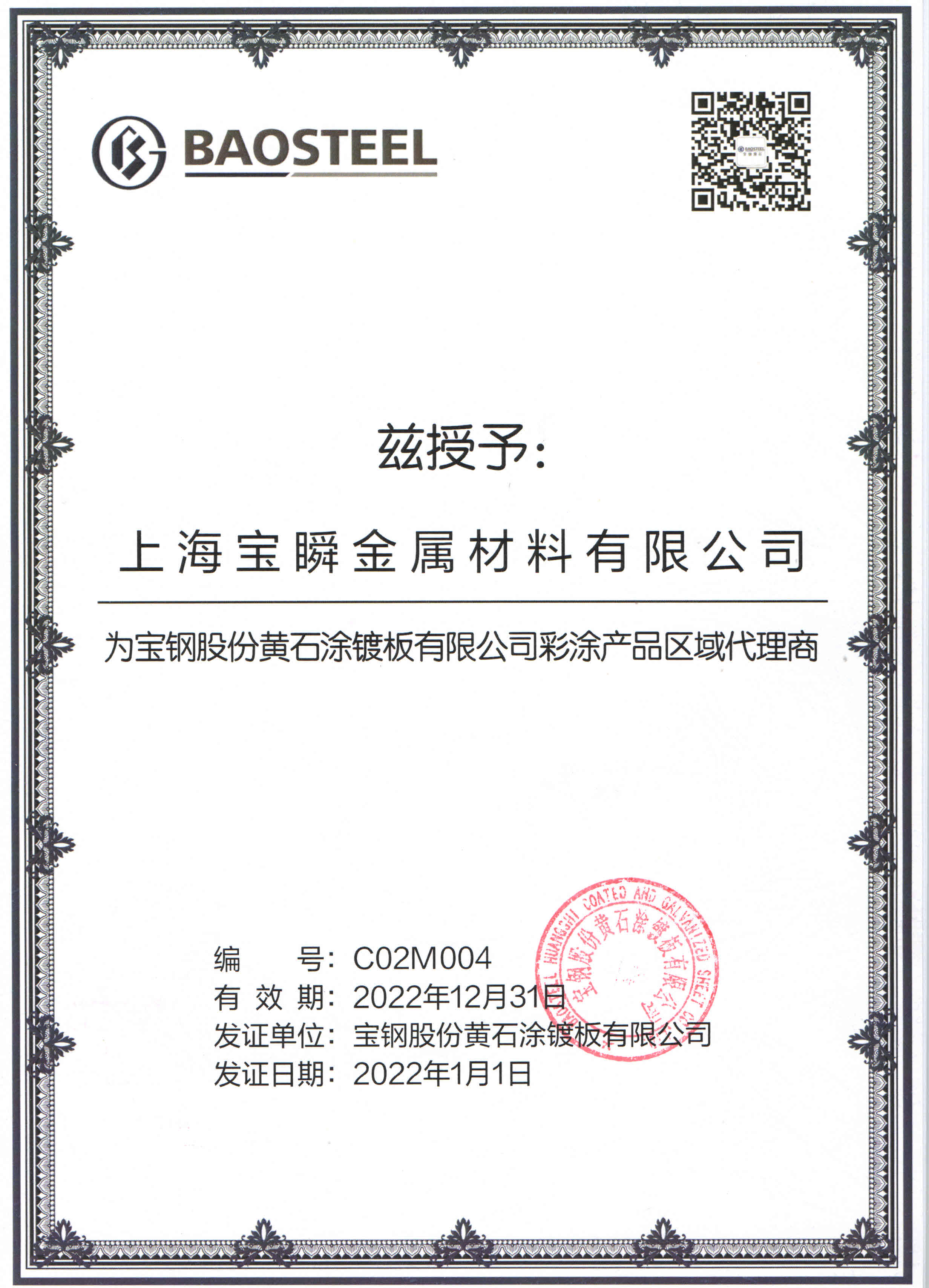 2022年寶鋼黃石代理證書(shū)