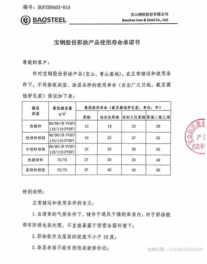 寶鋼股份彩涂產(chǎn)品使用壽命承諾書